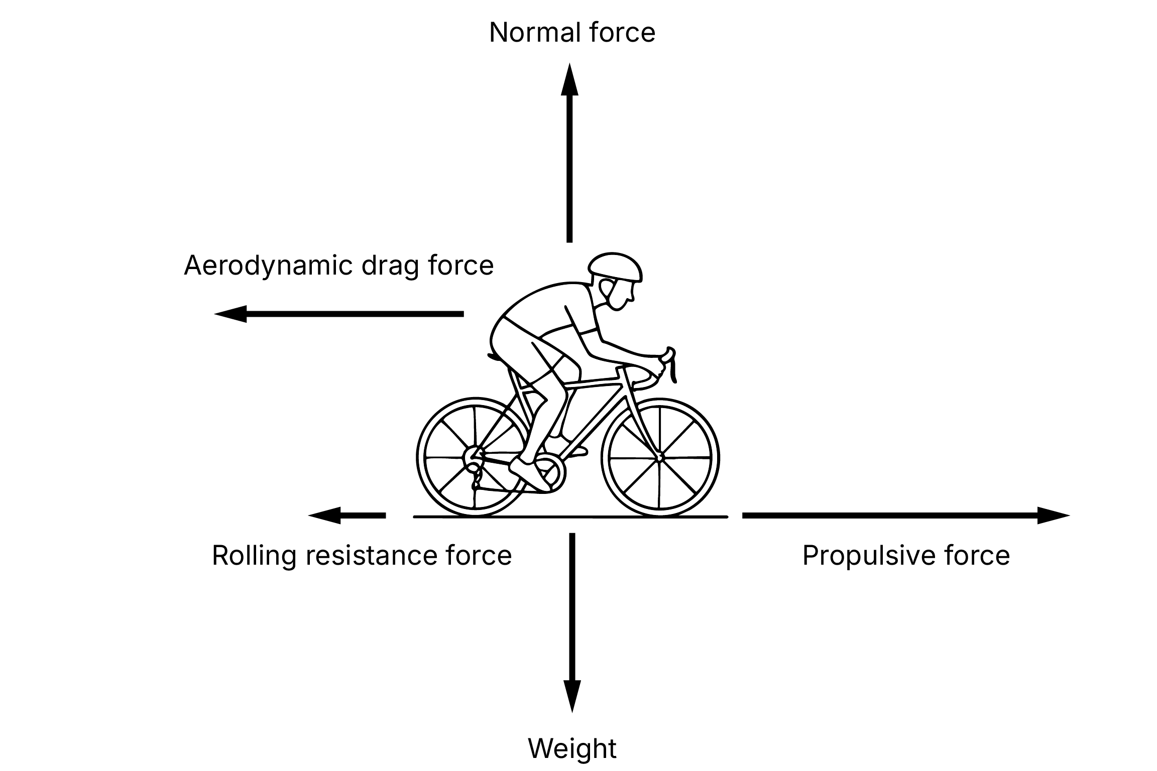 We won’t get too into the weeds with the propulsive force $F_p$ as this is largely understood by cyclists. Dealing with things such as drivetrain losses, whether or not to wax your chain (you should) or using oversized pulley wheels (who are we to tell you how to spend your money?) is beyond the scope of this article. Just know that we’re dealing with forces in this equation and not power. You can calculate $F_p$ by taking rider power (P) and dividing by velocity (v).